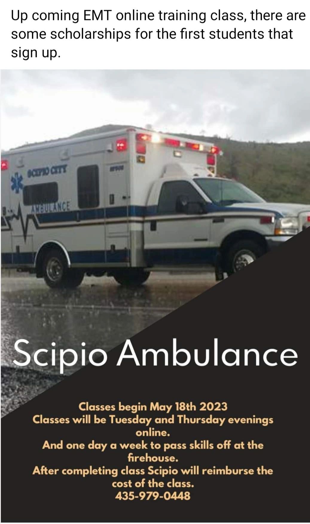 Our service had 40 total transports last year. We cover 30 miles of I-15, about 18 miles of SR 50 also covers Maple Grove campground. And roughly 300 residents of Scipio. Just sharing some details about our service with hopes it can encourage more volunteers. Registration for May 18 class opened today!!